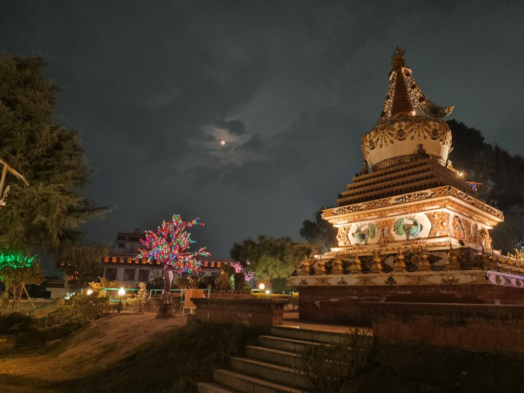 J’ai eu la chance de photographier le jardin du monastère à la tombée de la nuit. Le silence n’est rompu que par le murmure des prières et le vent dans les drapeaux. C’est un moment de calme nécessaire avant de plonger dans le cœur de ma mission solidaire. La beauté du lieu, illuminé sous les étoiles, est indescriptible.