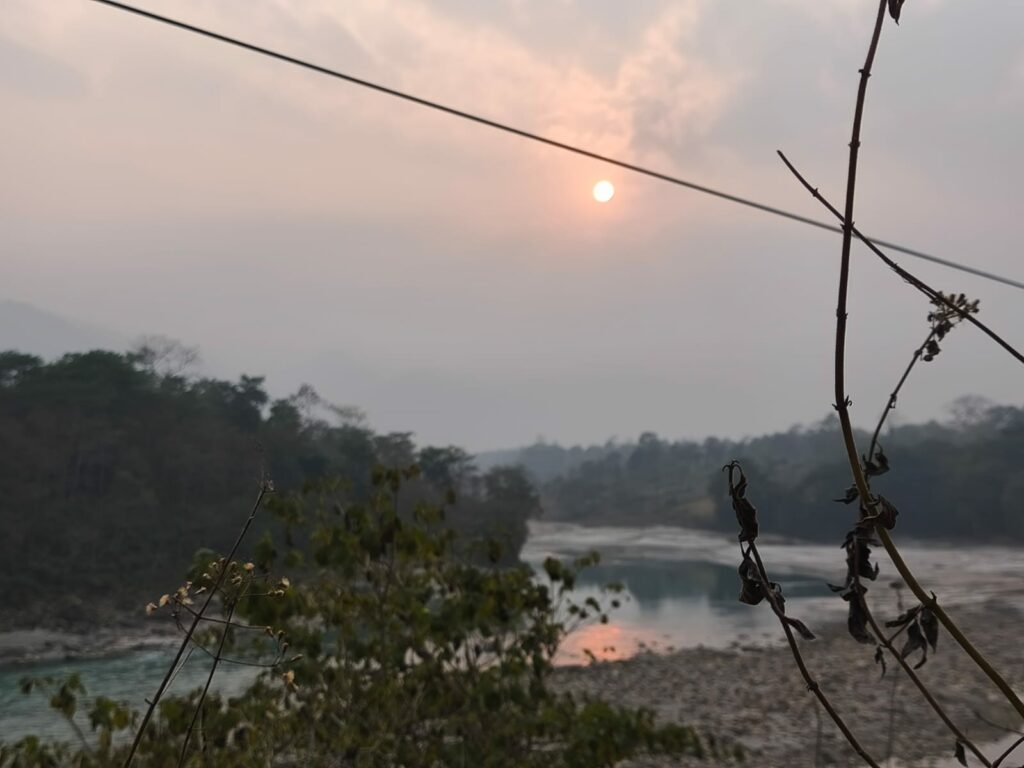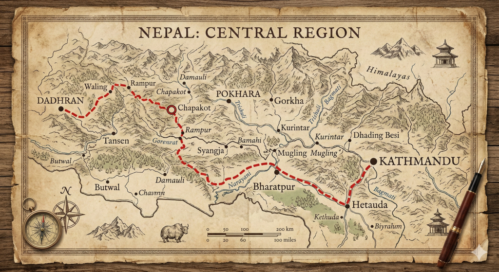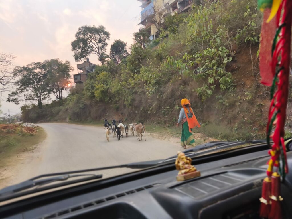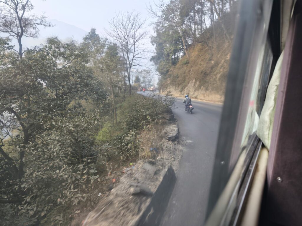 La route entre Katmandou et Chapakot se fait plutôt bien dans l’ensemble, même si le code de la route local est parfois… créatif ! On est bien secoués, c’est certain. Il y a tout de même eu un passage d’environ 30 mètres assez impressionnant, avec le ravin d’un côté et la montagne à 5 cm de l’autre, qui rappelle que circuler ici reste une expérience à part entière.