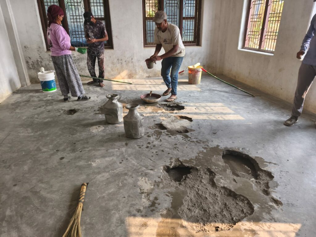 Nous avons retrouvé deux maçons et des femmes du village venues nous aider. Le travail a commencé par la préparation des trous à reboucher, ce qui consiste à les vider du sable et des cailloux jusqu’à atteindre une surface dure. Ils ont fait le tour des classes, des marches et des encadrements de portes. Dipak, le plus expérimenté en rénovation, donne légitimement le ton.