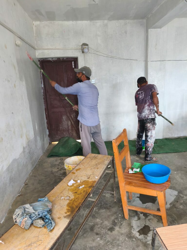 Après le nettoyage des salles par les femmes, nous avons attaqué l’apprêt (la première couche de peinture blanche). Nous avons commencé par la future salle de maternelle — plus grande et lumineuse que la précédente — en faisant les contours de fenêtres, les murs et les plafonds, puis une seconde salle au premier étage.