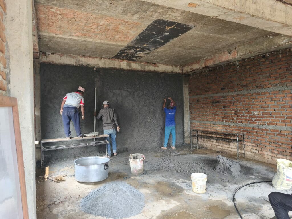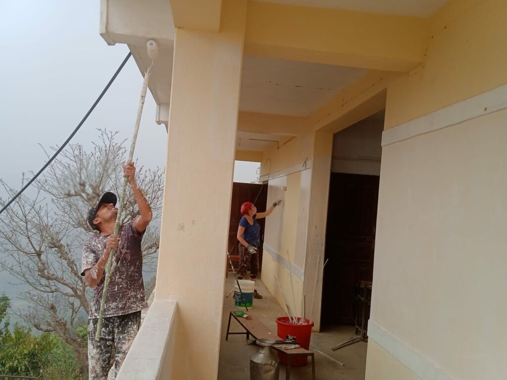 Direction l’école pour retrouver mes comparses à la cuisine. Petit-déjeuner de chapatis et hop : Kam ma Jam ! Rouleaux, pinceaux, peinture : apprêt pour les murs extérieurs en blanc, noir pour les portes… on ne s’arrête plus ! Le chantier a considérablement avancé dans le bâtiment supérieur inachevé : les maçons modèlent les murs (je ne suis pas experte, merci par avance pour votre indulgence sur la partie technique), ils appliquent sur les murs de brique un mélange de ciment, de sable et d’eau.