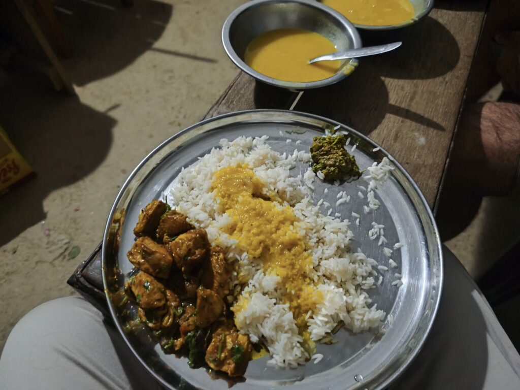 Retour au village avec les mêmes points de vue splendides. Je prends très peu de photos, je préfère m’enivrer en direct de ces images. Rama nous a préparé un Dal Bhat de poulet : c’est la première fois que nous mangeons de la viande à Thatibhanjyang. Cela ne m’avait pas manqué jusqu’à ce que je goûte la préparation de Rama : une dinguerie ! (Nom très peu distingué mais terriblement justifié !).