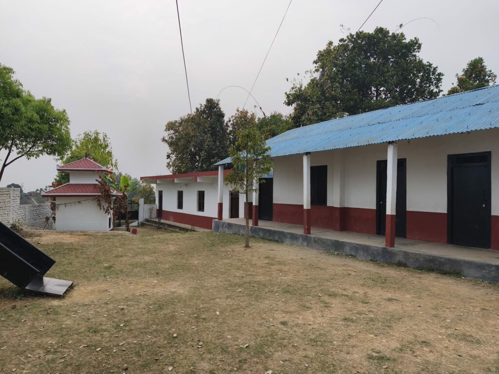 Je m’installe sur la moto. Basanta a un casque, il n’en a pas pour moi, mais « c’est normal au Népal » ! Nous empruntons non pas une route, mais plutôt un chemin, ou un trait sur une carte. Les nuages se sont un peu levés, le décor est splendide : montagnes sculptées pour les cultures, maisons colorées, une dame perchée en haut d’un arbre qui cueille des légumes… Nous arrivons après 10 minutes, cheveux au vent, à Baricuna. Basanta a contacté un instituteur qui nous ouvre les portes de l’école Balc Alhen, qui a été rénovée par l’association il y a 6 mois.