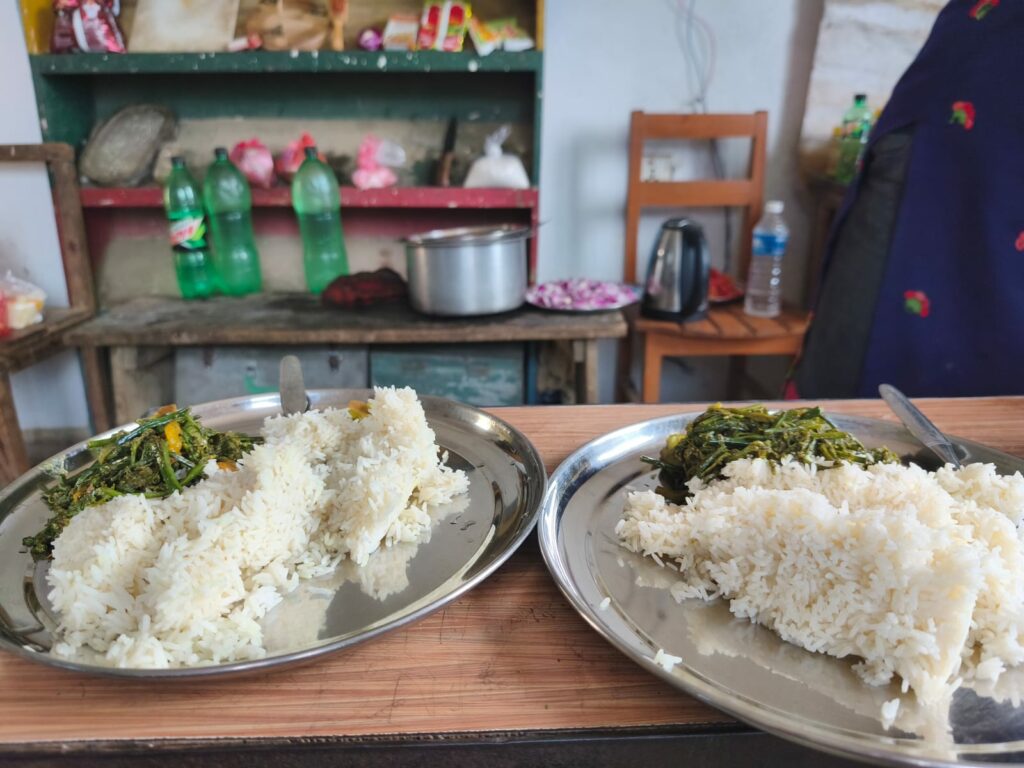 Après avoir repris l’activité dans une autre salle de classe, vient l’heure du déjeuner : un délicieux Dal Bhat aux épinards sauvages de la forêt. Un véritable régal.