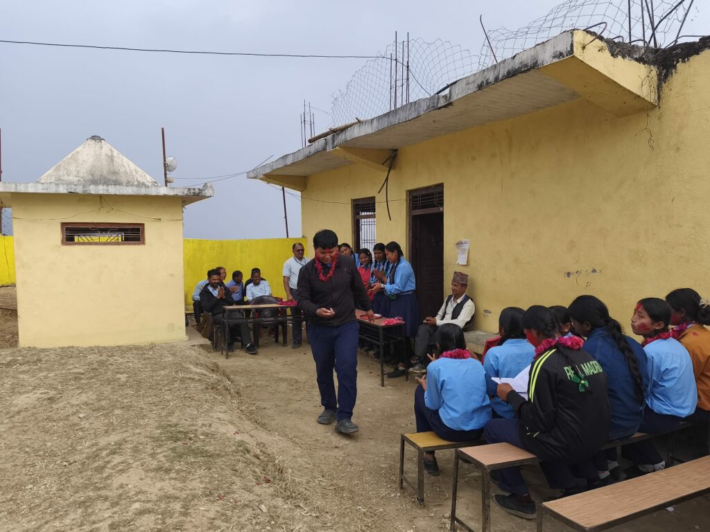 À 14h, Basanta m’accompagne à une cérémonie particulière. L’école Jana Jagriti assure les cours jusqu’à la classe 10 (l’équivalent de la première générale). En présence des professeurs et du directeur, les élèves de classe 9 ont préparé une cérémonie d’au revoir pour leurs aînés. Chacun des dix élèves reçoit le Tika et un collier de bougainvilliers.
