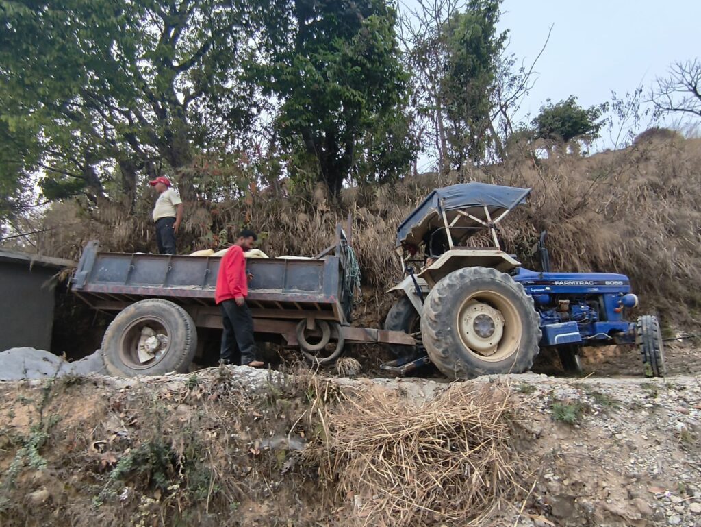 Plus tard, un tracteur entre bruyamment pour livrer du ciment. Je m’étonne auprès de Basanta que les trois hommes ne se relaient pas pour porter les sacs. Il m’explique que celui qui porte est payé davantage, au nombre de sacs transportés. Tout s’explique, même si le pauvre homme devait être épuisé.