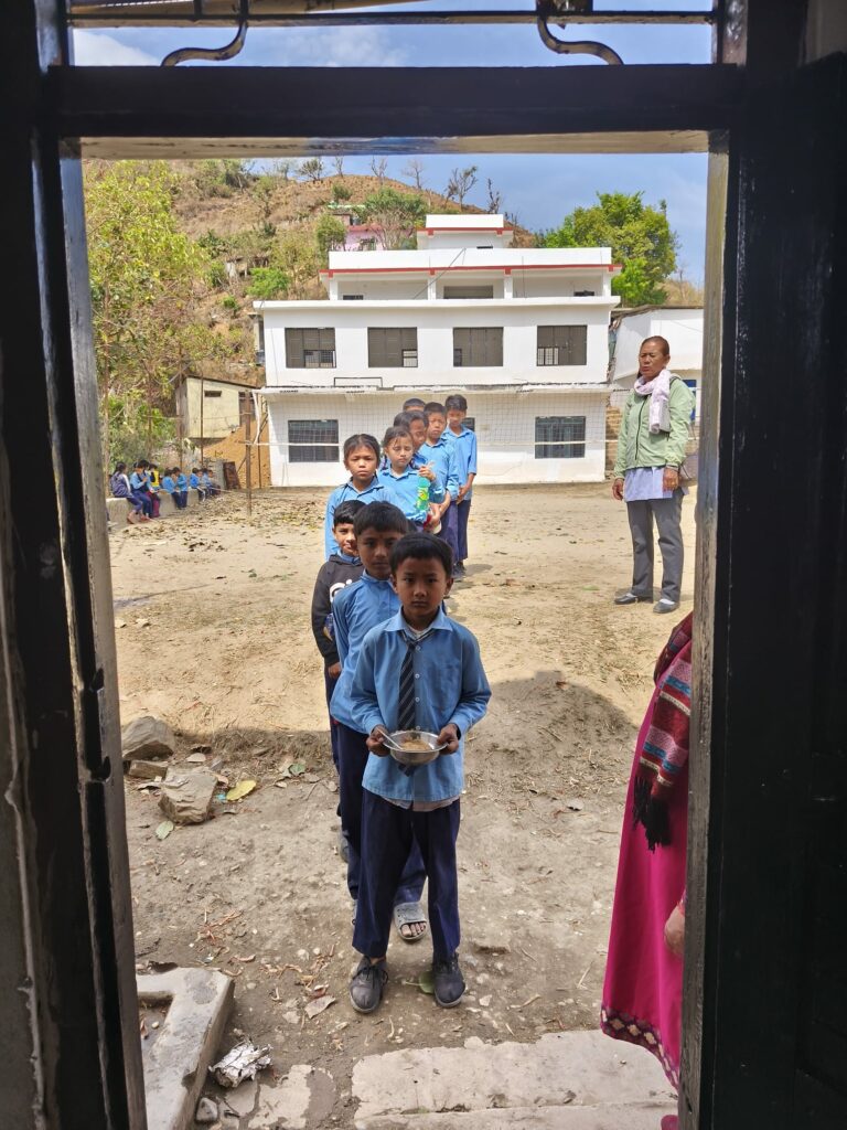 Après le repas, je reste un peu dans la cuisine pour assister à la distribution du goûter. Rama a préparé un mets sucré à base de semoule. Les enfants se placent en ligne devant la porte avec leur gamelle pour recevoir leur portion (pour les plus jeunes uniquement). Je m’approche du grand faitout contenant la « potion magique » et, armée d’une cuillère, je goûte la préparation : c’est simple et délicieux.