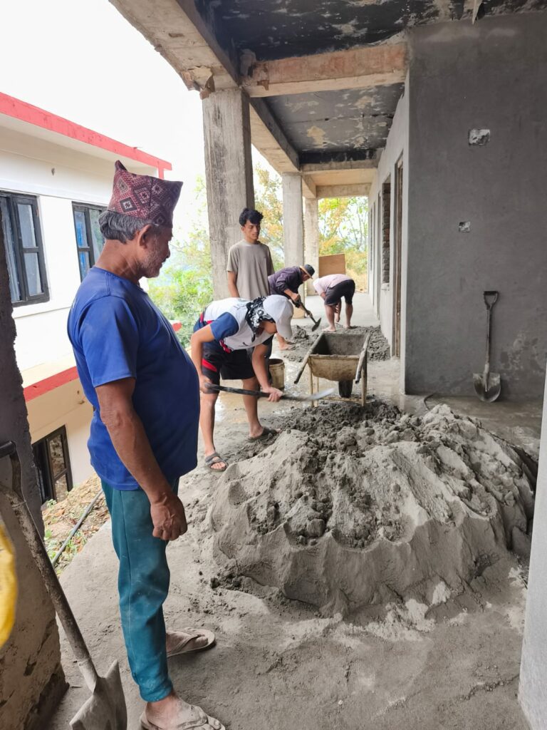 Nous achevons notre journée vers 16h30. Je fais le tour de la bâtisse : les maçons sont des machines ! Avec l’aide des villageois, ils achèvent le sol de la terrasse du bâtiment inachevé. En contrebas débute le chantier de stabilisation du sol déblayé derrière le bâtiment principal.