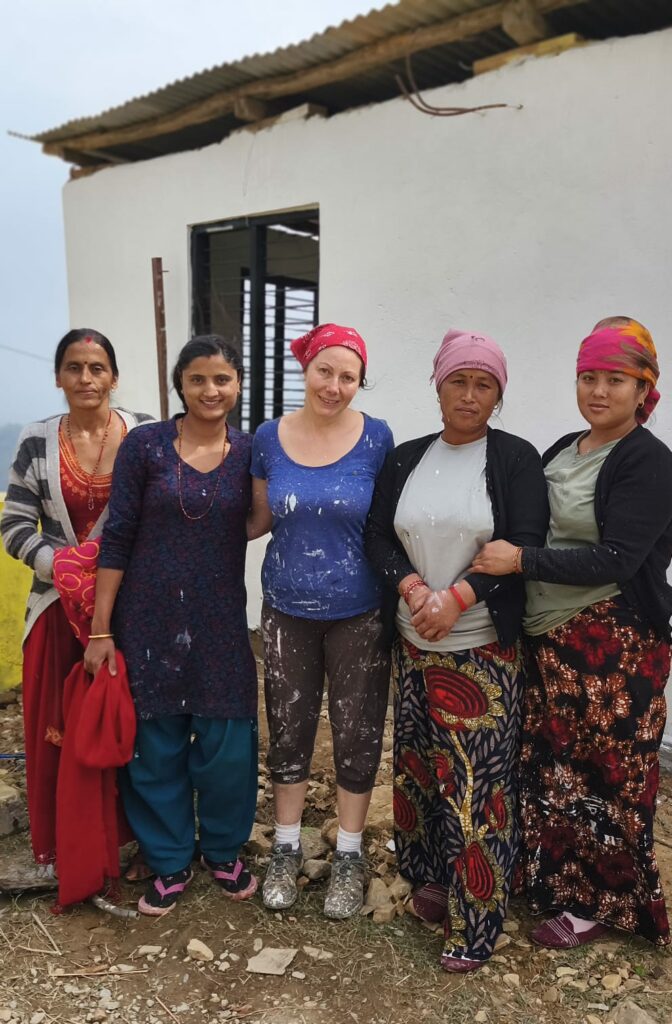 Je suis en binôme avec Deepak aujourd’hui. Pour se mettre en jambes, rien de tel qu’un peu de peinture depuis la corniche pour la deuxième couche de blanc ! Ensuite, nous enchaînons les deuxièmes couches en intérieur. Des femmes nous ont rejoints ; Deepak les équipe de pinceaux et de rouleaux.
