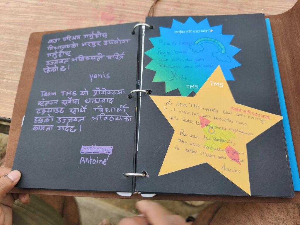 Basanta est allé chercher du matériel de plomberie pour demain. Il a également effectué une tâche formidable pour moi aujourd’hui : il a traduit en népalais, avec cette écriture si douce et esthétique, les textes du livre d’or que je remettrai à l’école. Les soutiens qui le souhaitaient avaient ainsi la possibilité de laisser un mot pour les enfants et la communauté.