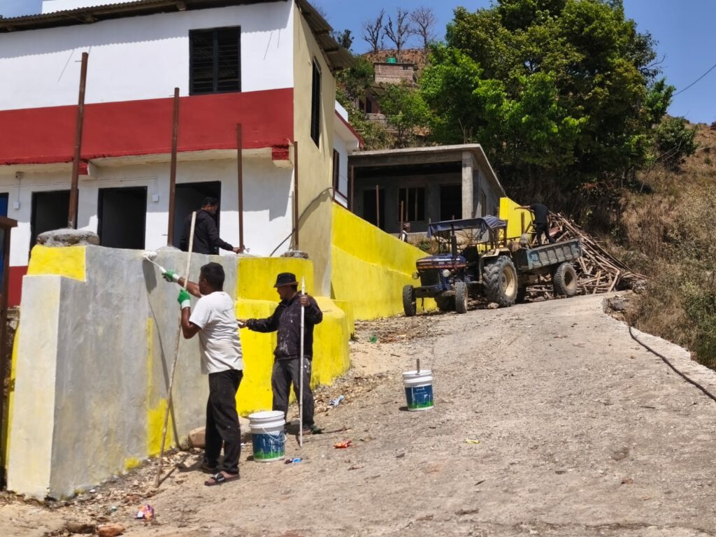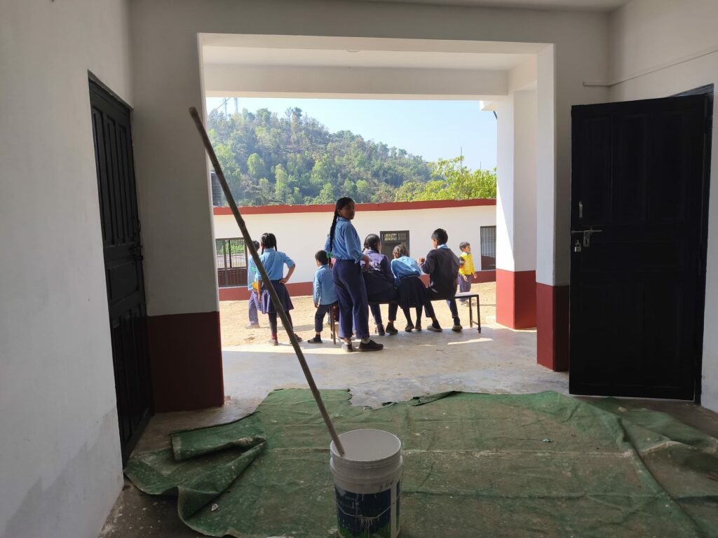 Je suis en rupture de peinture pour la deuxième couche, j’en profite pour jeter un œil sur l’enceinte de l’école : Jay, Deepak et un des hommes du village ont commencé à peindre le mur extérieur. Cela transforme totalement l’allure de l’école, crée une unité, c’est superbe !