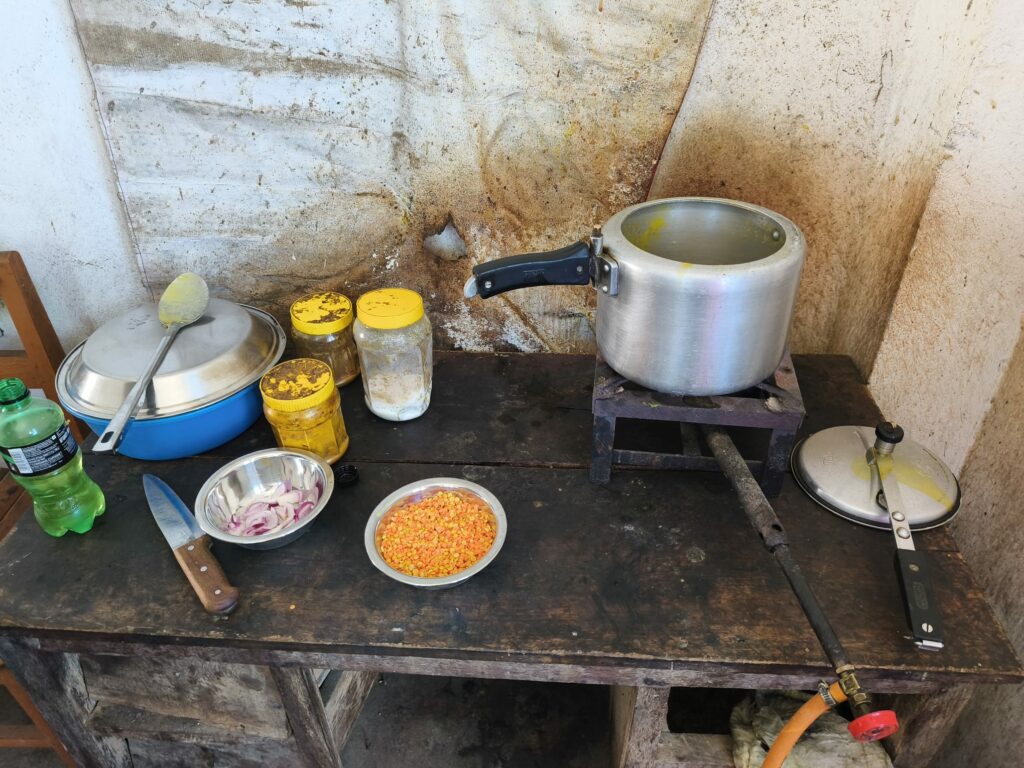 Je passe par la cuisine faire ma pause, il y a toujours des enfants ou des professeurs. Je tombe à pic pour apprendre à cuisiner le Dal aux côtés de Rama : huile, oignons, lentilles corail et jaunes, curcuma, masala, sel et de l’eau, et c’est parti !