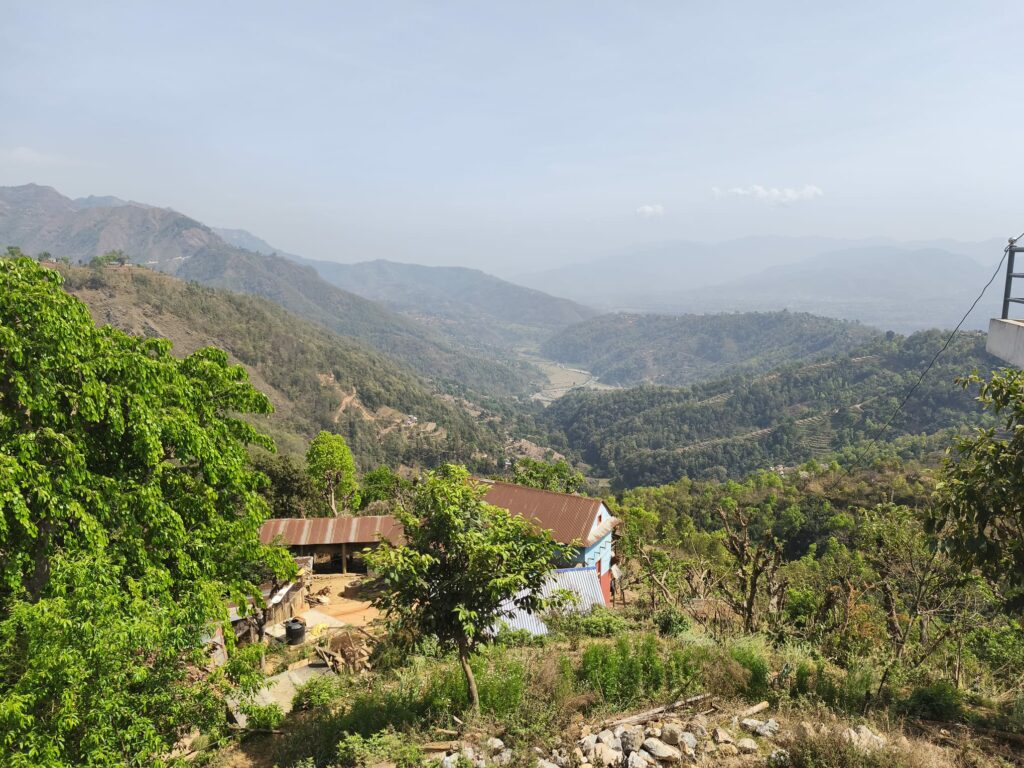 L’altitude n’est pas élevée mais les montagnes sont abruptes, couvertes de végétation. Ici, une crête qui descend dans la vallée avec quelques espaces un peu plus larges : c’est suffisant pour y avoir construit une maison et créé un espace cultivable. Vision improbable, les Népalais et les montagnes s’apprivoisent, se tolèrent, cohabitent. Les conditions y sont rudes, mais les « collines » (en dessous de 3000 m, il est question de collines ici) sont leur terre.