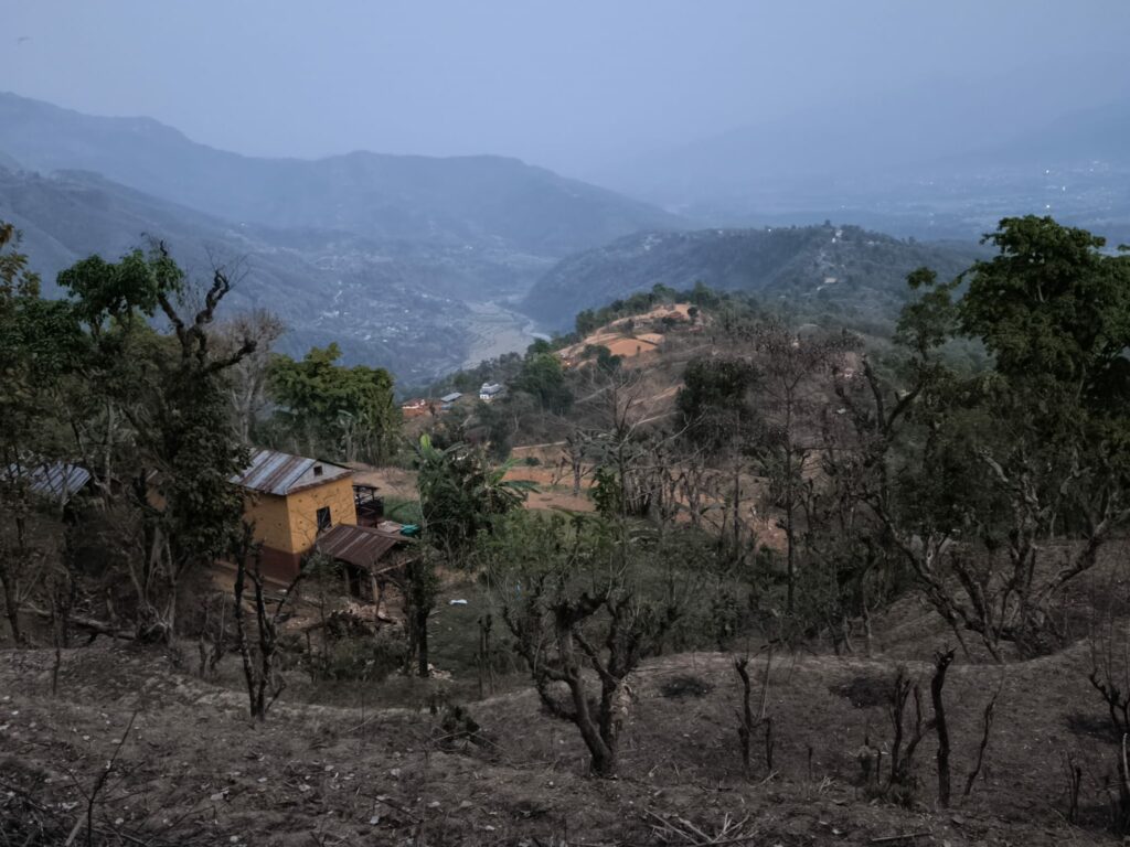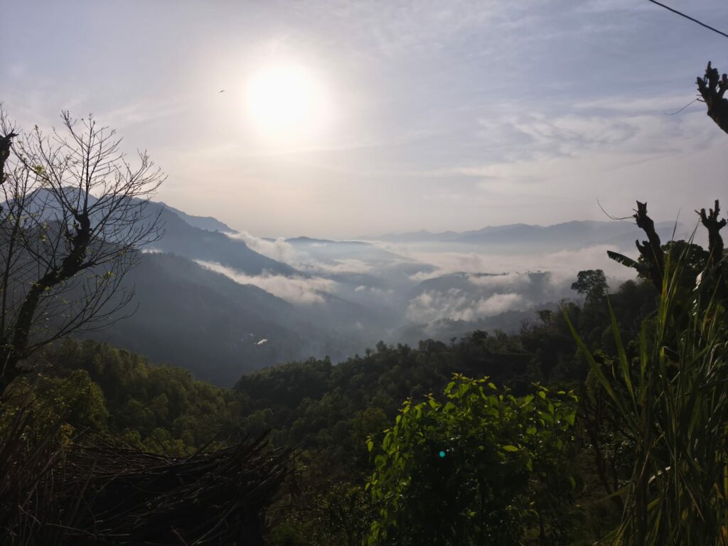 Après les cours et une bonne douche, comme convenu, je rejoins Bindu pour un milk tea chez elle. Quelques mûres en guise de goûter, et nous laissons les deux filles à son mari pour partir faire une balade sur la colline. Elle est très prévenante, me conseille d’être prudente et de marcher doucement. Ça grimpe, c’est vrai, et je suis toujours en claquettes ! Le paysage qui s’offre à nous est superbe.