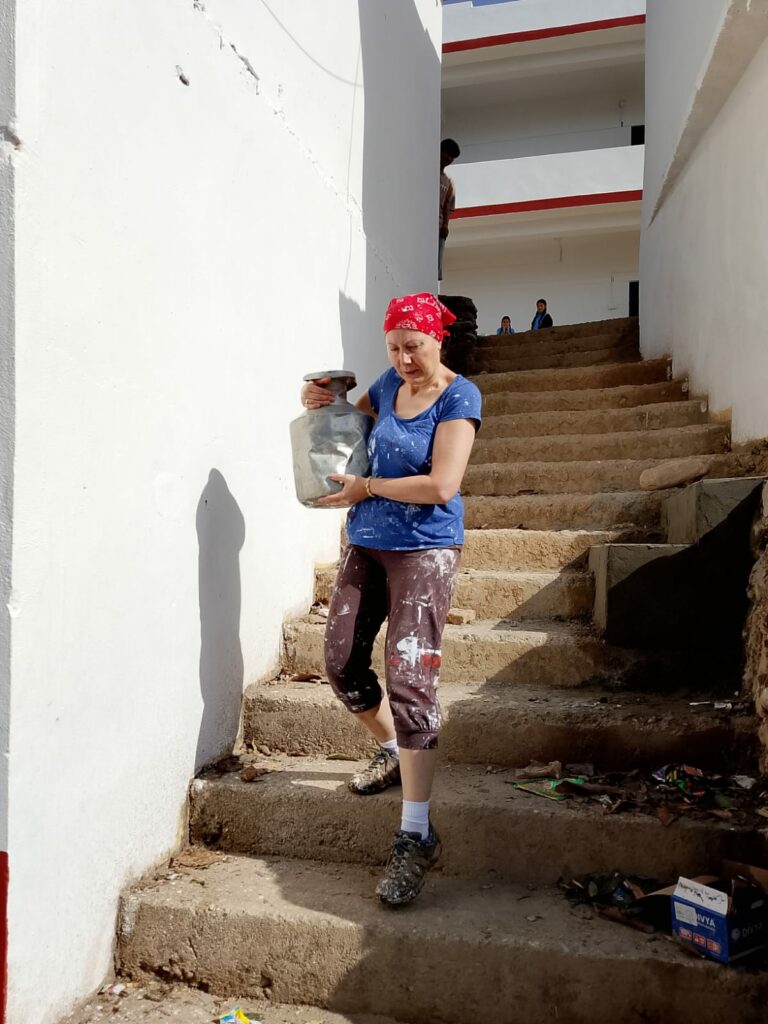 L’équipe a travaillé sur les peintures extérieures et j’ai procédé à des finitions sur les encadrés de fenêtres. En voyant Rama remplir les cruches de 10 litres d’eau au tuyau sur la terrasse supérieure, je me suis dit qu’un peu d’aide, si modeste soit-elle, serait la bienvenue. J’ai donc copié ses gestes : soulever la cruche sur une petite plateforme, puis la positionner sur ma hanche.