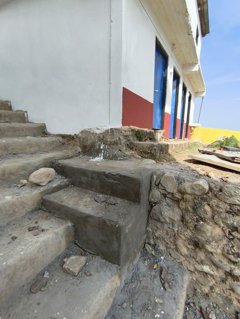Plutôt tranquille le Kam ma Jam. Sur le chantier, le rythme est tranquille. Les maçons continuent d’arroser et de perfectionner les enduits et la chape. Ils ont également construit des marches pour l’accès aux toilettes, car le passage existant était dangereux pour les petits comme pour les grands, et ont redonné forme à un banc de pierre qui n’avait rien de plat.