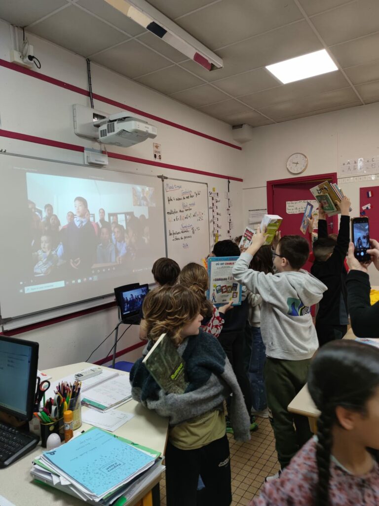 Après une courte sieste sur un muret inconfortable, j’ai rejoint Bindu pour un événement prévu à 13h45. Grâce à l’aide technique de Jay et à l’ordinateur portable offert à l’école, nous avons établi un appel vidéo avec la classe de CE2-CM1 de l’école Anatole France à Villemur (31).