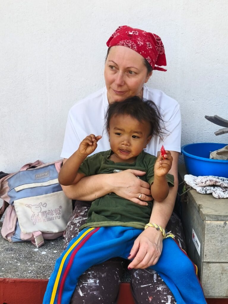 Après une dizaine de minutes, les enfants travaillent sur leurs activités. Je suis alors les institutrices décidées à faire le ménage par le vide sur une grande partie des sacs et cartons qui ont été sortis de la cuisine. Tout ce qui est jeté sera brûlé dans un grand bidon de métal, et même à côté. Elles sont un peu expéditives sur le tri ; je sauve de justesse un jeu de construction en bois qui n’est pas de première jeunesse certes, mais avec lequel Arus aime jouer. Elle m’accorde cette faveur ; elles s’amusent constamment de ce lien qui existe entre Arus et moi. Il aime à venir sur mes genoux, faire des câlins, il me fait également des bisous — fait assez rare paraît-il — nous jouons ensemble et lorsque sa construction de bois s’effondre il dit « Badaboum » comme je lui ai appris.