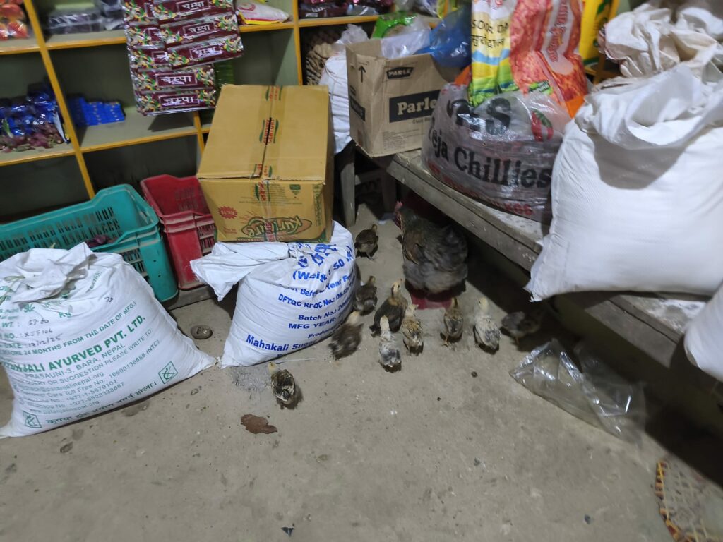 Je sens quelque chose sur mon pied : toujours la même question mentale en une fraction de seconde : ce qui me touche est-il animal, végétal, vivant ? Ce sont des poussins ! Dans la boutique, normal, elle en vend…