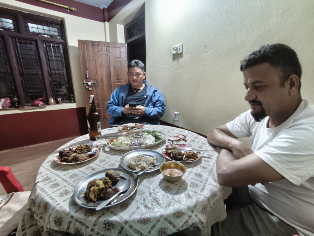 Armée de patience, de concentration, de bonne volonté et de capacité à faire abstraction du réel, je finis ces quelques morceaux de porc. Je mange quelques rondelles de concombre pour célébrer cette victoire quand tout à coup, je me décompose intérieurement : Debbie me ressert deux morceaux de porc, dont un avec une généreuse part de gras. J’ai dû manger sept momos, vraiment, je n’en peux plus.